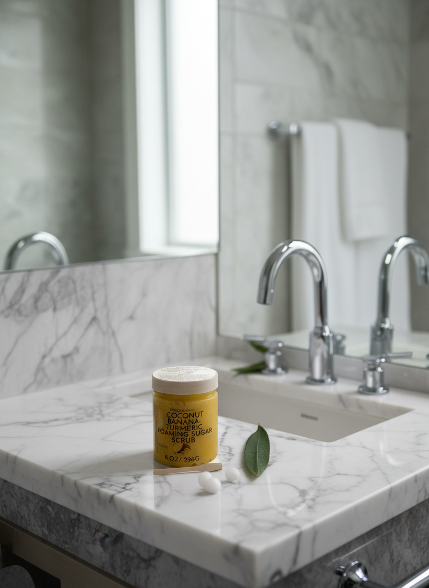 Achieve smooth and radiant skin with our 8oz. Coconut Banana Turmeric Sugar Scrub. Made with a powerful blend of turmeric, banana, Shea butter and coconut oil, it gently exfoliates to reveal a glowing complexion. The natural ingredients are scientifically proven to improve skin texture and leave you feeling refreshed. Experience the benefits of this luxurious sugar scrub now.